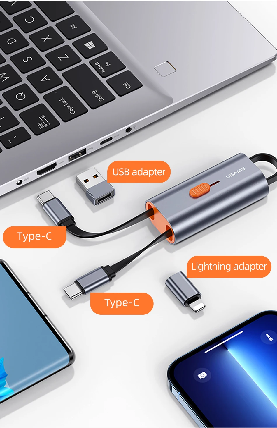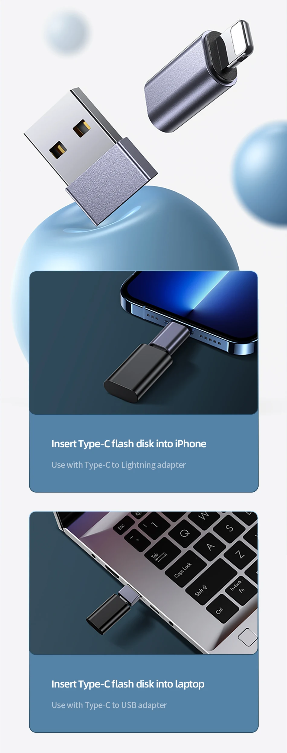 Comes with two adapters, applicable for deviceswith USB/Lightning interface to connect with Type-C cables/flash disks/wired earphones, etc.