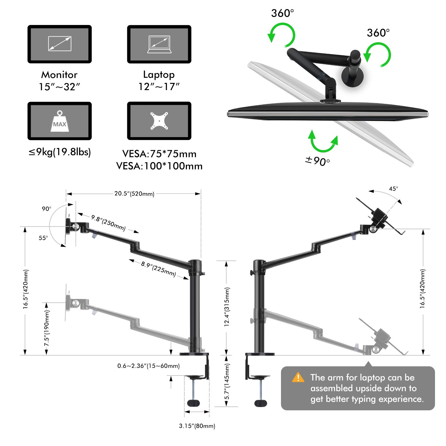 Aluminum Alloy Multifunction 2 in 1 Monitor and Laptop Dual Arm 360 Degree Rotation Mount